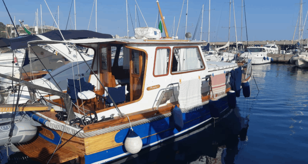 Gli interni, rifiniti in legno massello di mogano, offrono quattro posti letto totali: n.1 letto matrimoniale a “v” a prua e n. 2 letti singoli in dinette. È presente un bagno piccolo ma funzionale in locale separato, dotato di acqua calda e fredda. La zona giorno ospita un angolo cottura attrezzato con lavello e cucina con due fuochi, affiancato da un’ampia dinette con tavolo estensibile/allungabile.
